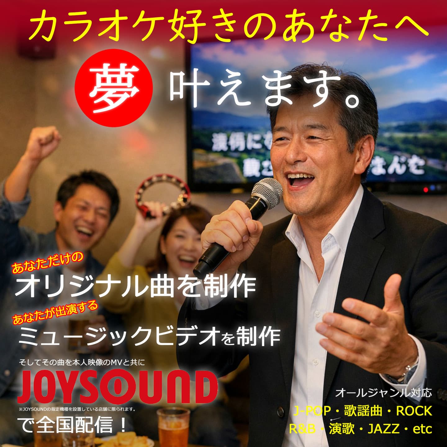 あなたの夢、叶えます。 残念ながら可能性を追うだけじゃ手に入らないものもあります。だから私たちは、「形」にして確実に前に進めます! あなたの夢、叶えます。 残念ながら可能性を追うだけじゃ手に入らないものもあります。 だから私たちは、「形」にして確実に前に進めます! 仲間たちと盛り上がろう!「え?噓でしょ?何で〇〇の曲がカラオケに入っているの?」と間違いなく周りがびっくりする至高のエンターテイメント 仲間たちと盛り上がろう!「え?噓でしょ?何で〇〇の曲がカラオケに入っているの?」と間違いなく周りがびっくりする至高のエンターテイメント